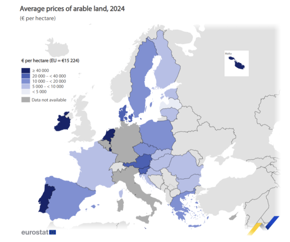 Parmi les 24 pays pour lesquels des données sont disponibles, le prix moyen le plus élevé pour un hectare de terre arable a été enregistré à Malte (201 263 €), suivie des Pays-Bas (96 608 €) et du Portugal (76 556 €). En revanche, c’est en Lettonie que le prix moyen est le plus bas : 4 825 €/ha.